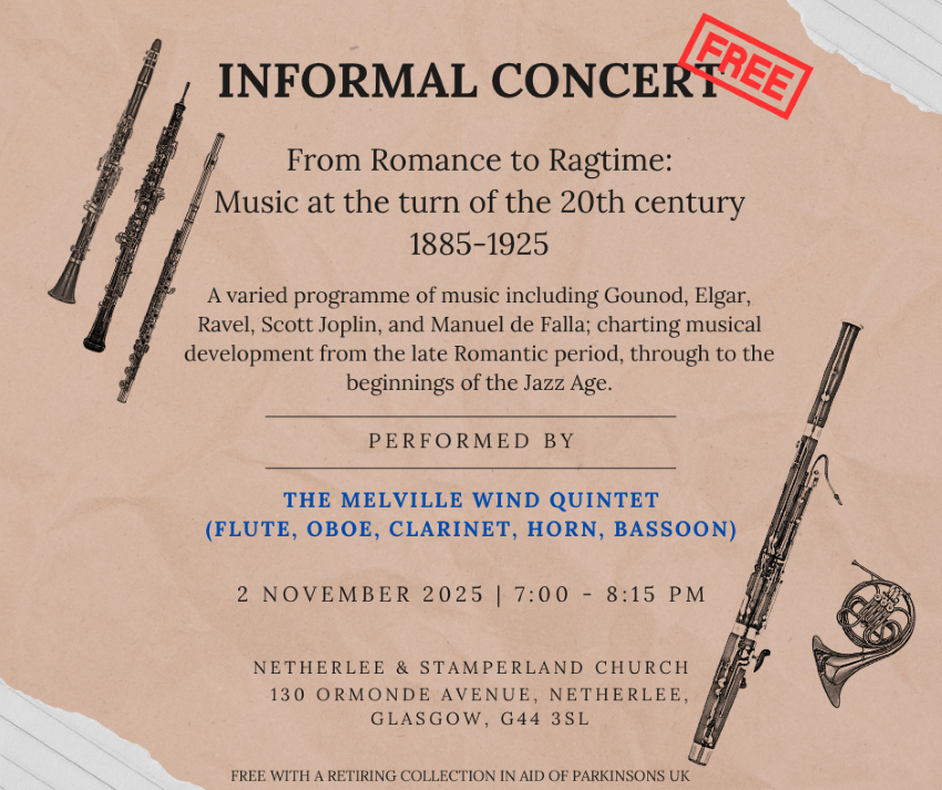 Join the Melville Wind Quintet for their programme ‘From Romance to Ragtime – music 1885 to 1925 ‘, a concert in aid of Parkinsons UK. Full details are contained in the image.
